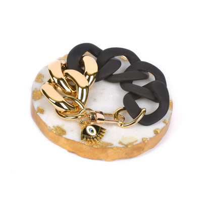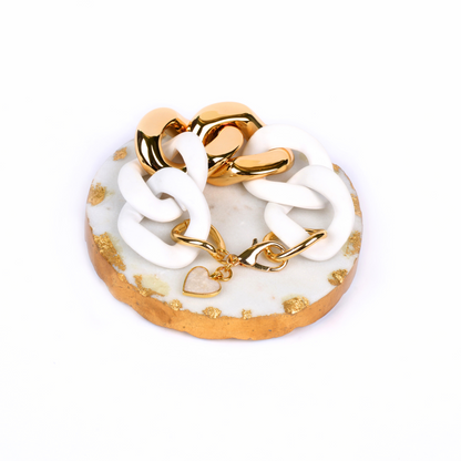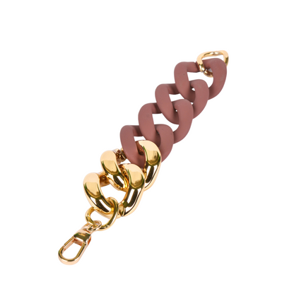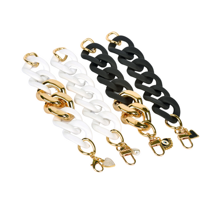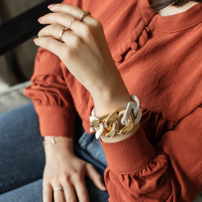 - Crafted from premium materials such as acrylic links, gold-plated aluminum, and stainless steel, this piece has a 3 cm width and measures 18 to 20 cm long when clasped. For added versatility, we have included a matching acrylic link or extension chain.